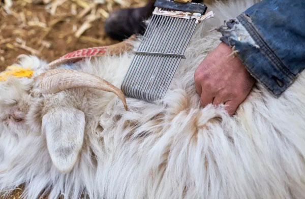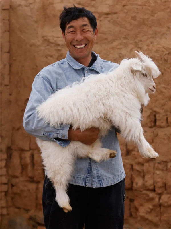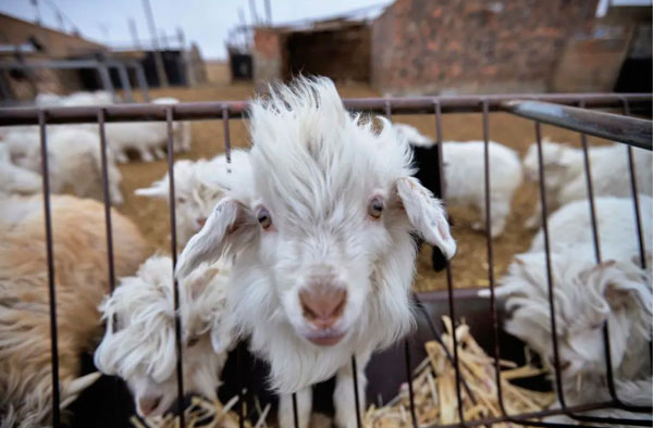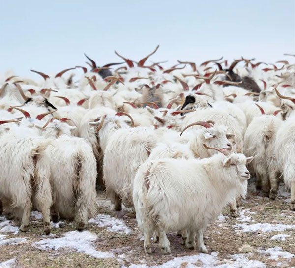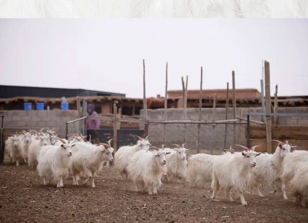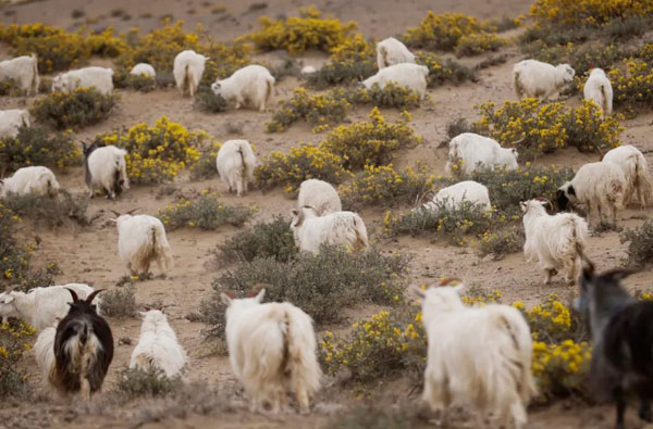 極端的氣候,創造了極致的山羊絨。冬季零下20°C的嚴寒中,當地山羊外表皮粗毛根部自然長出更細膩軟糯的絨來保護自己,阿拉善山羊絨也因此憑借出眾的細度,讓這塊“五彩斑斕之地”成為了全球頂級羊絨產地。