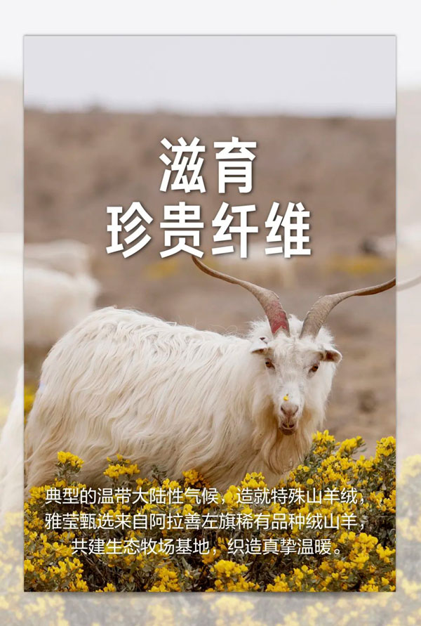 為發揚中國優質山羊絨,雅瑩加強建設源頭基地,甄選阿拉善優質生態牧場,增加地理標識認證,讓每一件羊絨大衣、每一片羊絨織片、每一根羊絨纖維的源頭可追溯。