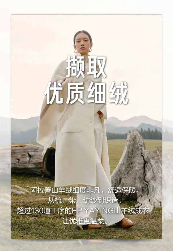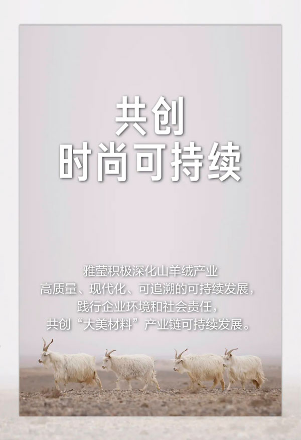 2023年,雅瑩簽署《阿拉善白絨山羊絨地理標志證明商標授權使用協議》、《 阿拉善羊絨高質量發展,低碳行動倡議書》,加入“國際山羊絨產業技術聯盟”;2024年秋冬,將阿拉善地理商標認證運用到服裝上,確保原材料來自阿拉善核心產區;同時,持續與產業鏈伙伴共創山羊絨“五化”:高端化、立體化、四季化、針織化、毛衫化,形成技術、策略層面的創新研發,拓展材料生命周期,落實羊絨多,品類的立體高端精品,共同推動中國羊絨產業的高質量發展。