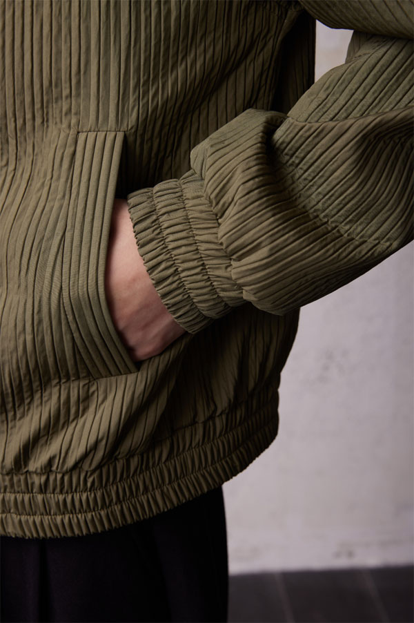 采用特殊面料,通過工藝處理形成肌理褶皺效果,賦予了衣物獨特的質(zhì)感和外觀。復(fù)古橄欖綠的配色更是增添了服飾的復(fù)古氣息和時尚感。