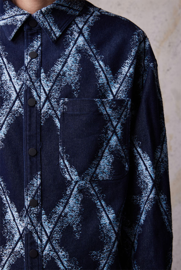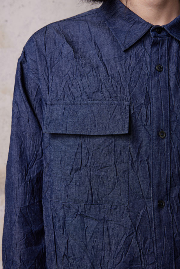 襯衫采用牛仔面料后工藝,壓皺效果。丹寧藍(lán)色總能帶來自由和率性,柔軟的牛仔面料是不經(jīng)意的慵懶感。