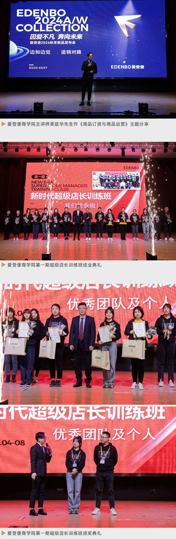 2024年愛登堡著力人才強企策略,啟動愛登堡商學院,設立超級店長訓練班,第一期超級店長訓練班在三月上旬成功舉辦,首期訓練班結業典禮和頒獎典禮亦于本次發布會舉辦。愛登堡將持續以20人精品小班模式設立超級店長訓練班,致力于更好地提升和幫扶門店精英的運營實踐能力,賦能終端。