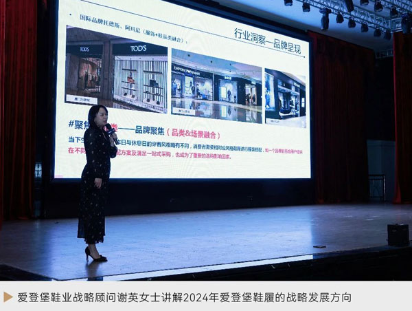 在發布會的最后,愛登堡鞋業戰略顧問謝英女士上臺,為大家講解2024年愛登堡鞋履的戰略發展方向。聚焦多品類矩陣是現階段企業發展的重要階段,其中鞋業作為多品類重點發展項目,將助力品牌銷售增長、單店盈利提升、客戶復購,從而實現優于競品發展速度。2024年愛登堡鞋業將在總部戰略的驅動下,以“戰略目標”和“文化價值”為核心,堅持科技引領創新,健康塑造價值的理念,打造《愛登堡健康科技生活館》。