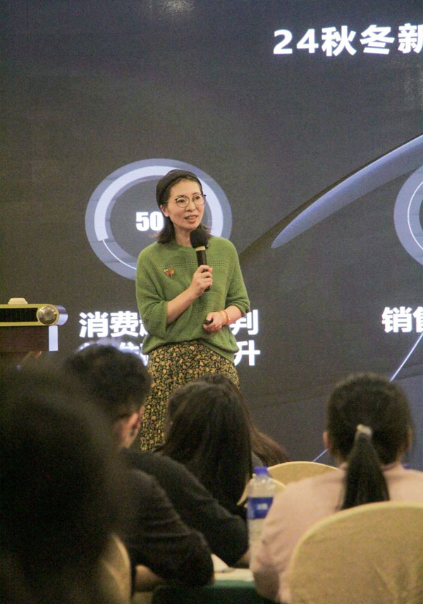 為了更好達成精準訂貨,品牌主理人繆總對24秋冬產品進行了更深入的解析,首先,結合對未來時髦的流行趨勢,從風格、搭配、疊穿、色彩、面料、版型上剖析各種問題,講解后,還特別加入了模特試衣穿搭環節。