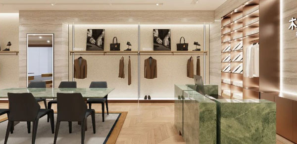空間點綴“綠色石材”以及綠植等呼應品牌的自然感,同時在空間內產生新的視覺張力與焦點,成為品牌空間形象上別具一格的記憶點,讓原本嚴謹的西服更添一份張弛有度、從容自然。用建筑般的簡約線條來設計裝道具,既能襯托服裝的展示,又能表達杉杉“現代紳士”的理性、干練。