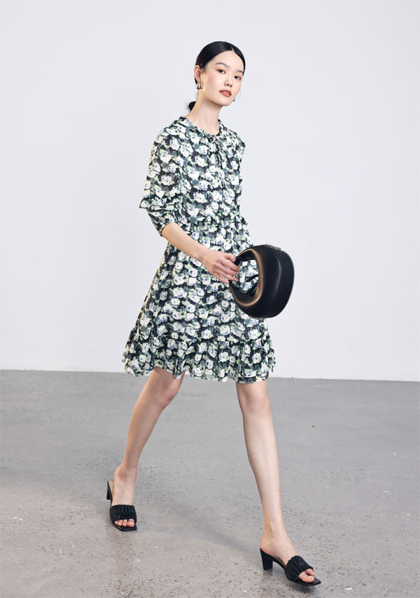 暈染抽象印花,絢爛而又溫柔,面料略帶肌理感,輕薄垂順,荷葉邊的裝飾增加衣服本身層次感。