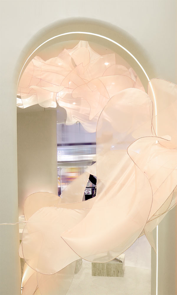 大型藝術裝置聚焦視線中心,花瓣薄紗透過光影自然地延伸,將女性力量優雅柔美展現以當代設計語言,為奢華購物創立質感意境盡展品牌考究本質。全新形象延續精致名媛的生活方式,捕捉美學靈感,與服裝產生共鳴,以空間為集聚地對話衣裝,暢談藝術理念與生活本源。