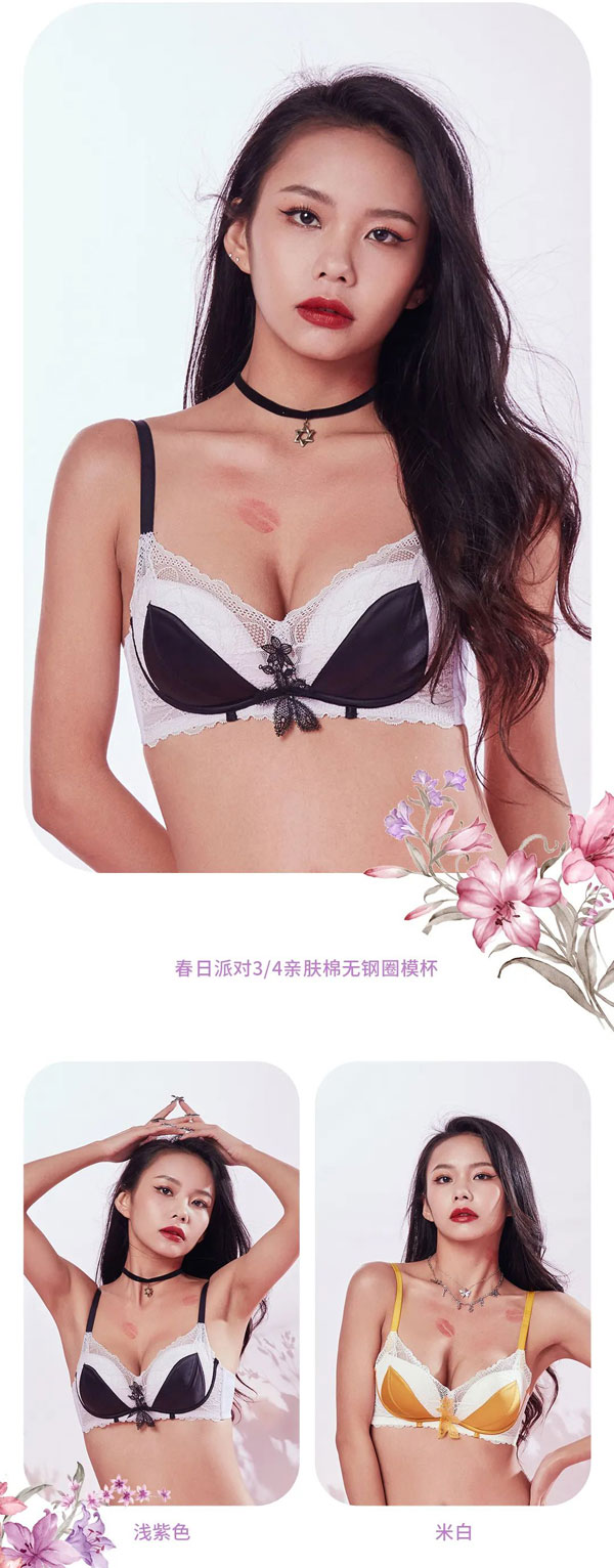 超柔軟的中厚款親膚棉模杯圍,無鋼圈設計, 加倍提升舒適度;杯面花邊拼接撞色色丁,時尚高級,浪漫性感,女人味十足;