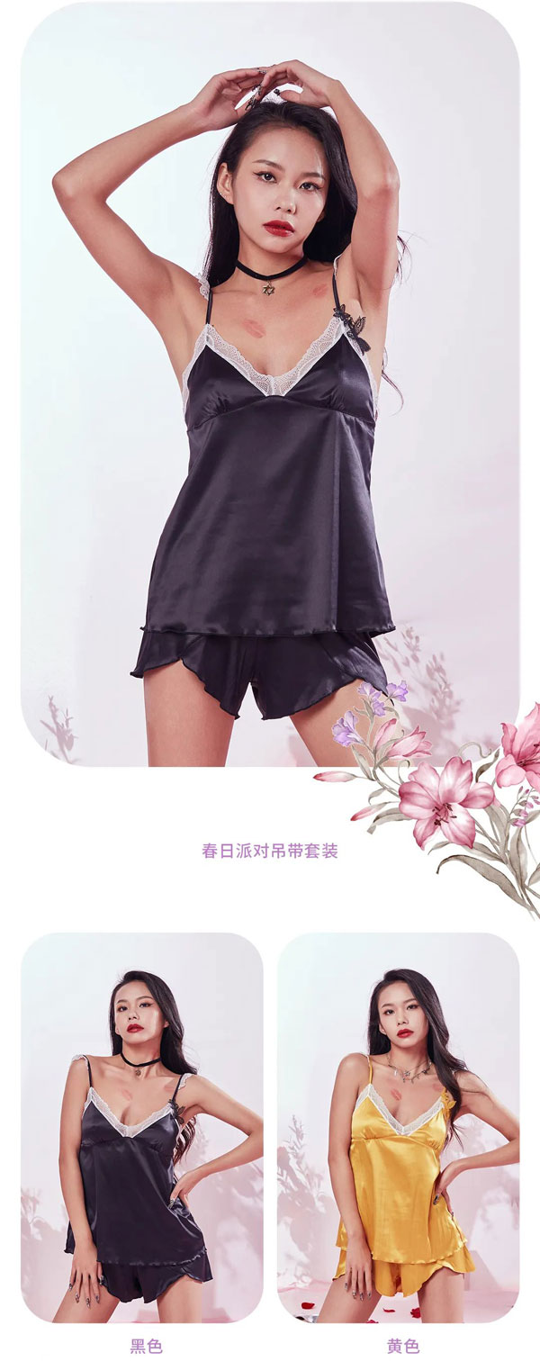 時尚俏皮的吊帶套裝,帶胸墊設計,適應多種場合穿著;色丁面料的選用,凸顯高級感,杯邊及肩帶選用蕾絲花邊裝飾,時尚性感,女人味十足。