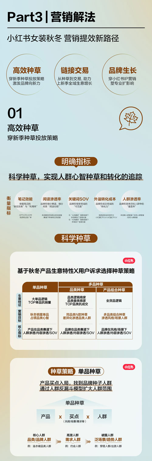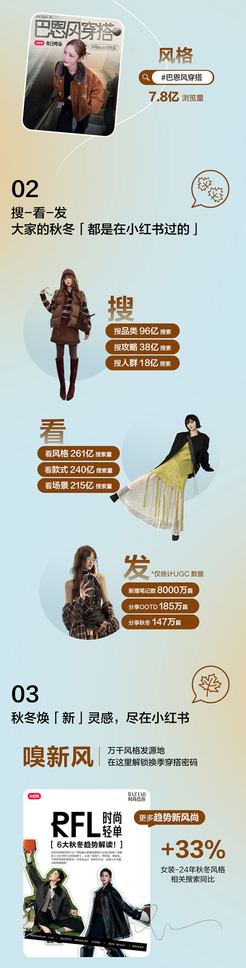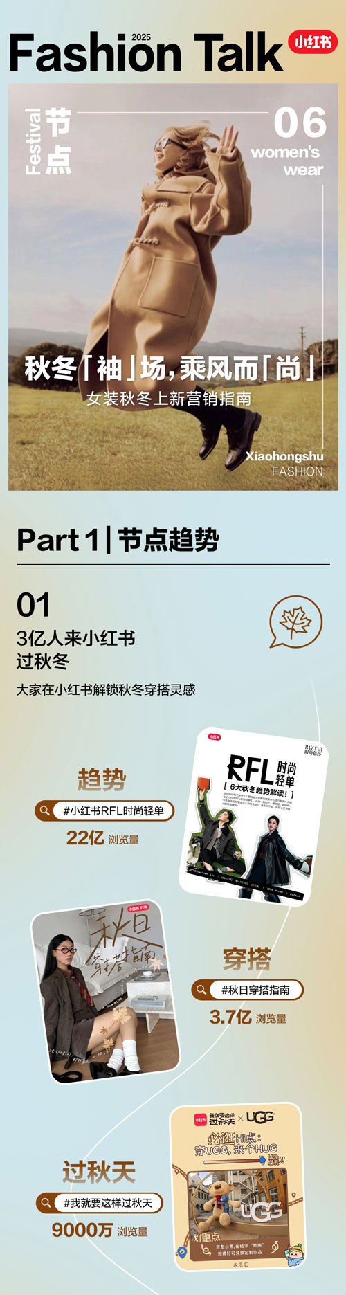 本期小紅書帶來「女裝秋冬上新營銷指南」,基于秋冬季女裝潮流風向,以「節點趨勢、品類洞察、營銷解法」三個維度展開深度營銷洞察,幫助更多女裝品牌把握季節煥新生意節點,成功找到上新營銷的種草方向感。