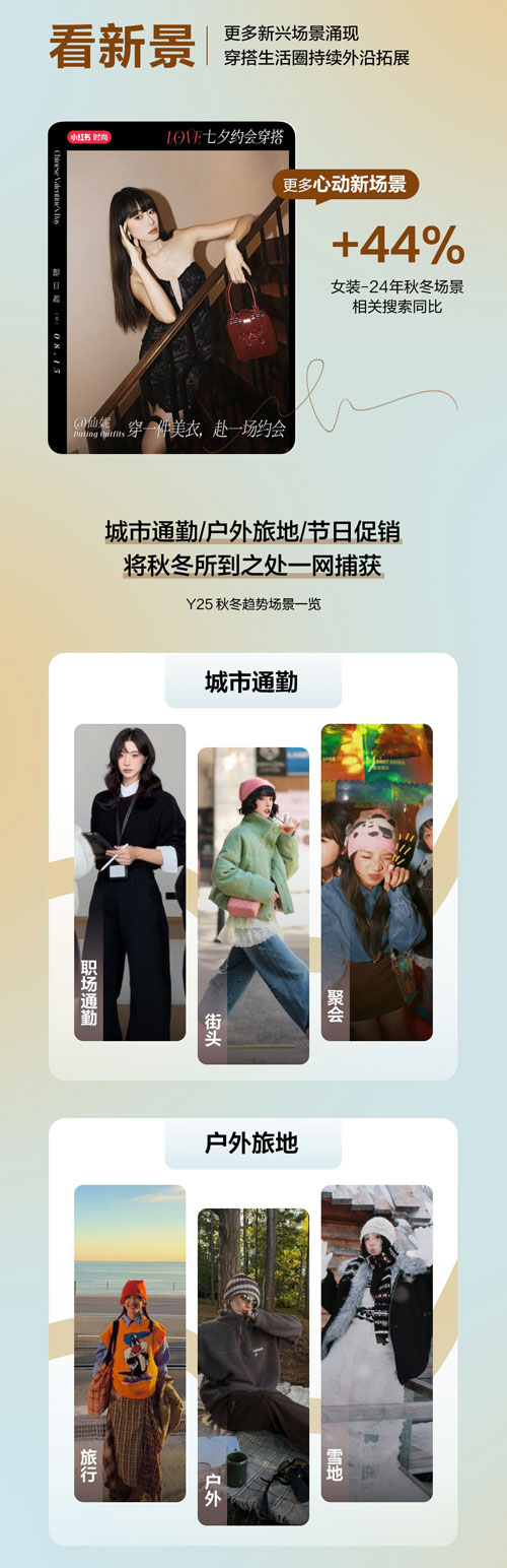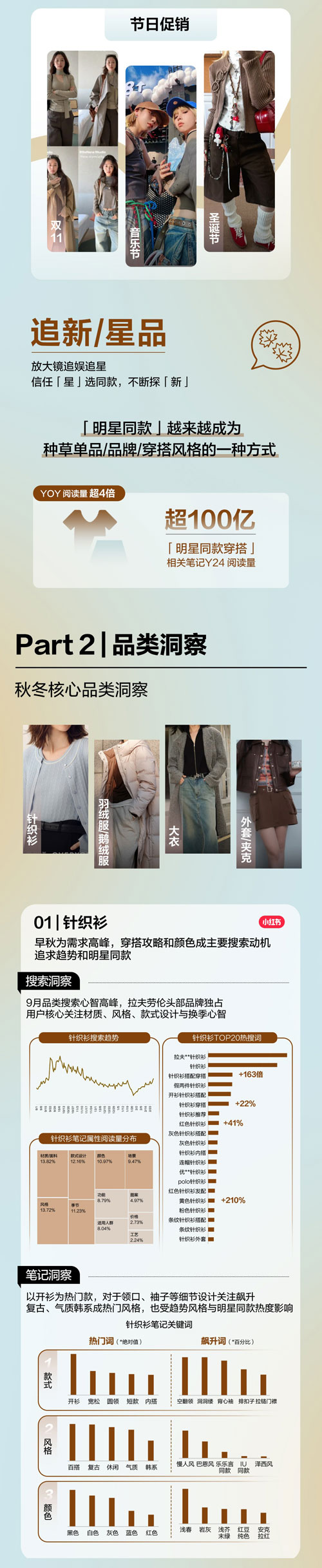 小紅書站內25年女裝秋冬趨勢「新風」凸顯,以生活方式為主的新興穿搭場景涌現,城市通勤、戶外旅地、節日促銷等多元場合下的穿搭趨勢成風;同時用戶在追新/星品上的種草心智日益成熟,24年小紅書圍繞「明星同款穿搭」相關筆記閱讀量超100億,「明星同款」逐漸成為種草單品,形塑穿搭風格的方式之一。