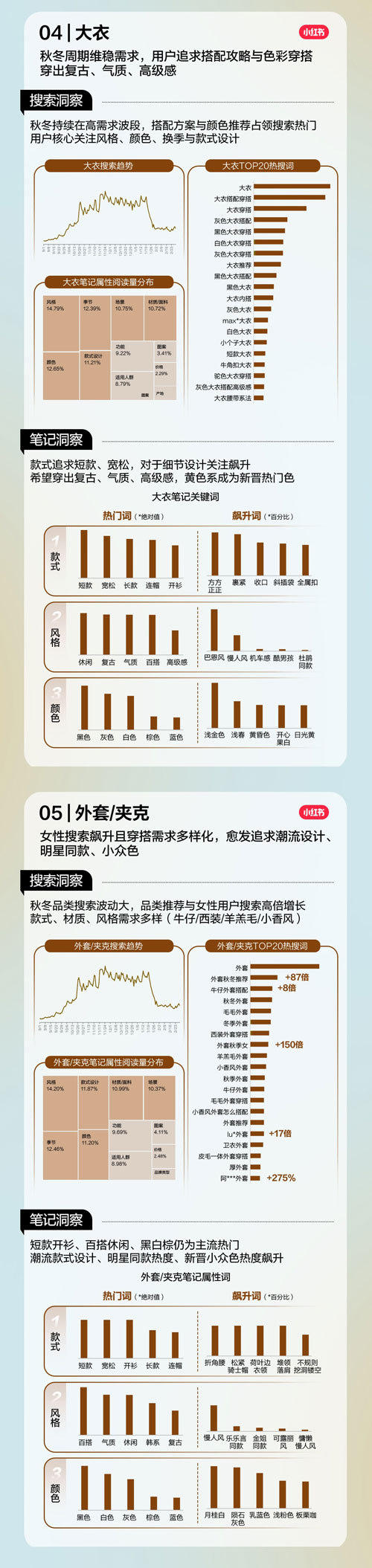 「大衣」在秋冬節點需求穩定,用戶關注剪裁設計與時尚配色,追求以「黑白灰棕」為主流色系的高質感穿搭體驗;