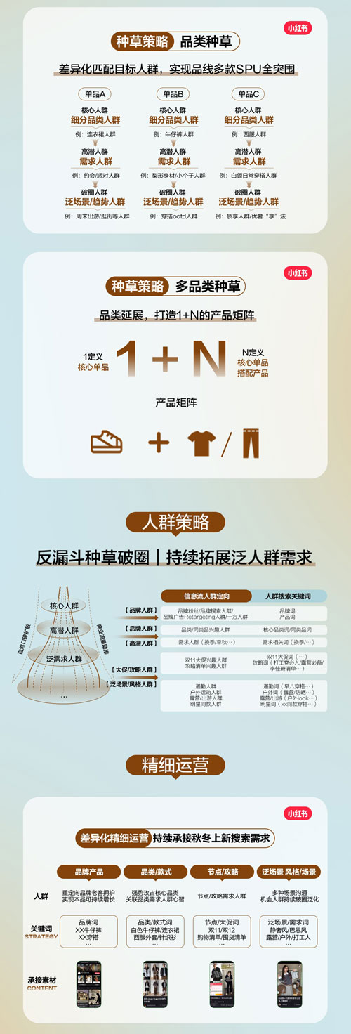 高效種草:小紅書以科學化指標體系支撐精準人群觸達,圍繞用戶真實的穿搭場景與風格偏好,優化種草內容策略;并通過獨有的「人群反漏斗模型」幫助品牌撬動更廣闊的泛人群增量市場。同時,結合搜索行為數據定制關鍵詞策略,實現“人找貨”場景銜接,提升種草轉化效率。