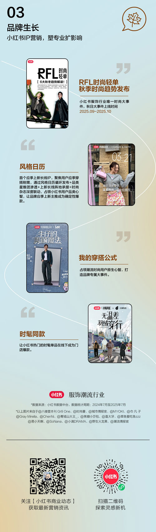 品牌生長:小紅書IP化內容矩陣為品牌提供行業發聲的高勢能舞臺。「RFL時尚輕單」「風格日歷」、「我的穿搭公式」「時髦同款」多樣化IP,以趨勢發布、風格定義、場景演繹等形式,引領大眾審美風向,助力品牌從“單品上新”升級為“風格上行”,持續深化品牌傳播影響力。