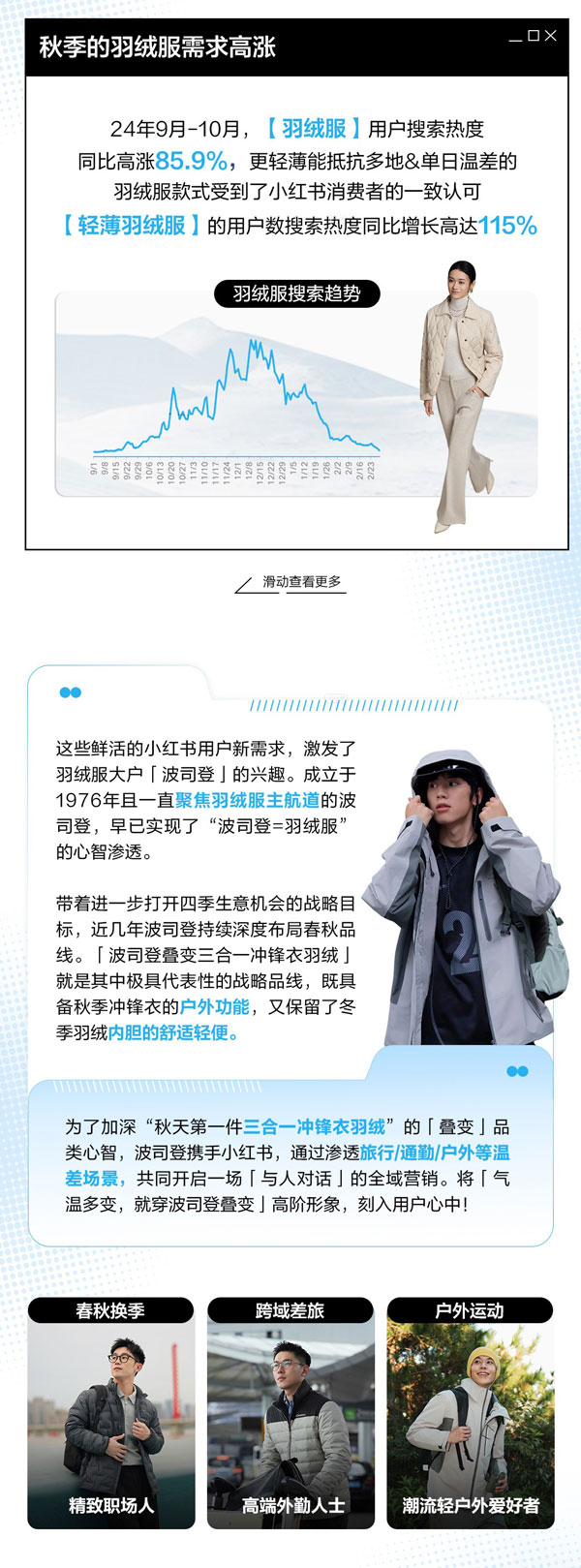本期【CASE 精選】聚焦波司登「疊變三合一沖鋒衣羽絨」,解讀其如何借勢秋冬季節(jié)羽絨服用戶新需求,以“通勤、旅行、戶外”等場景為切入點,突破季節(jié)限制,在小紅書完成從“品牌敘事”到“品類突圍”的閉環(huán),為成熟品牌如何在小紅書實現(xiàn)全域增長提供完整的實戰(zhàn)路徑參考。
