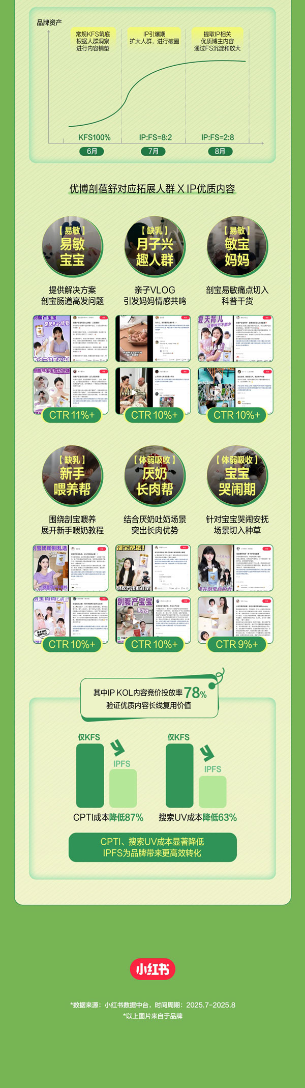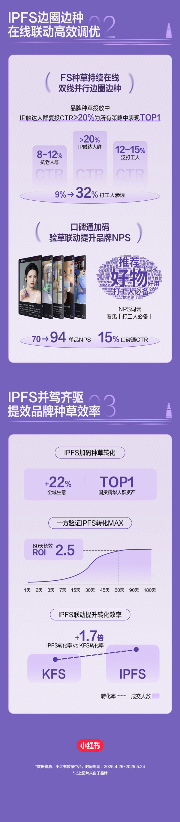 在IPFS的聯(lián)動(dòng)打法中,IP合作產(chǎn)出的優(yōu)質(zhì)內(nèi)容(KOL/UGC筆記為核心),可作為品牌優(yōu)質(zhì)內(nèi)容資產(chǎn)追投FS,實(shí)現(xiàn)原生口碑?dāng)U散,助力優(yōu)質(zhì)內(nèi)容的影響力漣漪式放大;同時(shí),IP觸達(dá)和互動(dòng)沉淀下來的精準(zhǔn)人群資產(chǎn),可通過定向投放與數(shù)據(jù)驗(yàn)證,實(shí)現(xiàn)種草效率與轉(zhuǎn)化率的全面提升。從而將IP流量沉淀為可復(fù)用的內(nèi)容資產(chǎn)與精準(zhǔn)人群資產(chǎn),持續(xù)提升品牌在小紅書生態(tài)內(nèi)的種草營銷效率,形成從品宣曝光到生意轉(zhuǎn)化的可復(fù)用增長路徑。
