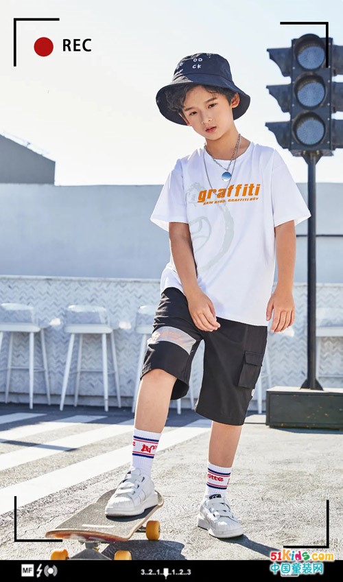 經典白T+五分黑色針織褲,個性印花+文字標簽,盡顯夏日少年張揚個性。